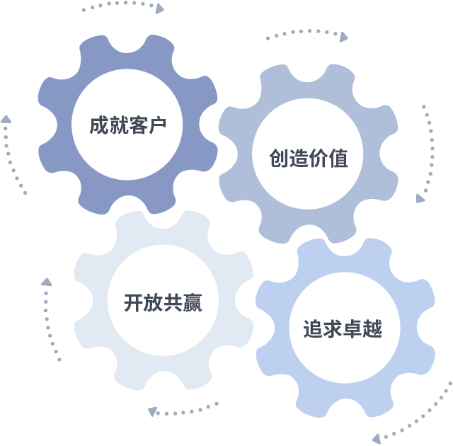 成就客户是一切决策的出发点,创造价值是衡量所有工作的标准,追求卓越是我们做事做人的态度,开放共赢是我们的格局也是最终的结果。价值观的齿轮环环相扣,推动着组织里的每个人不断向前。